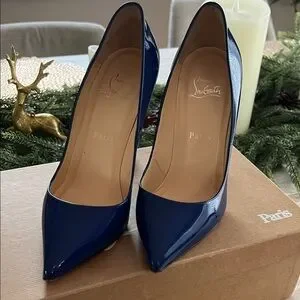 Sleek navy heels with signature red soles. Elegant and timeless design.