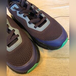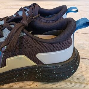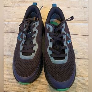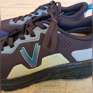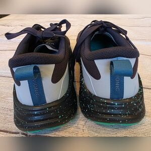 Stylish Vionic sneakers. Black mesh upper with blue accents. Comfortable and trendy design.