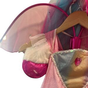Includes: Dress with layered rainbow tulle skirt & glitter unicorn print, attached tail, detachable wings, and matching pink headpiece/hat.