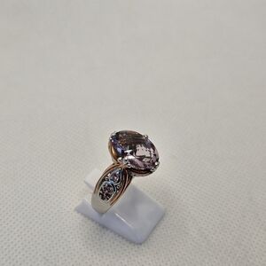 This ring features a large oval-cut kunzite with a light pinkish-purple hue. The small accent stones of pink tourmaline, are set into the ornate scrollwork on the band.
