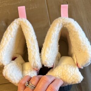 Cozy toddler winter boots with pink upper and black lower. Perfect for cold weather. These boots are in excellent condition. No stains, rips or tears. Only worn twice.