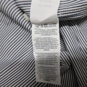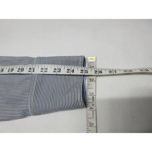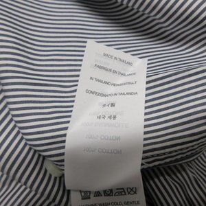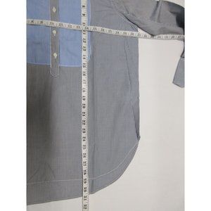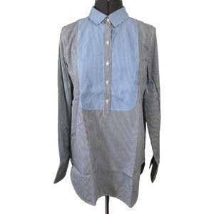 Cute hi-lo hem button front pinstripe shirt with contrasting bib front detail.