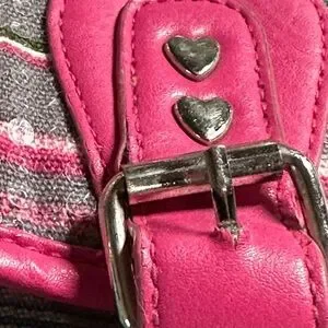 Betseyville by Betsey Johnson sequin crossbody messenger bag. Gray, teal, white and pink striped pattern with pink faux leather trim and sequined front flap with magnetic snap closure. Front zippered pocket and pockets on inside. Adjustable strap, silver toned hardware. Approximately 11x9x4.5"*