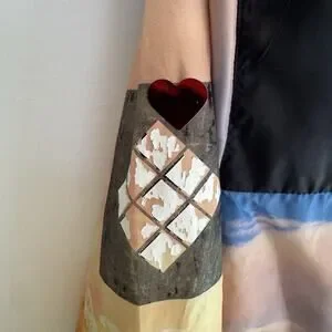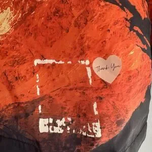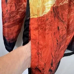 Features: Long sleeves, pockets, hood cinch strings, unique mountain scene print.