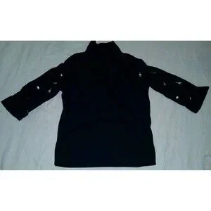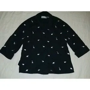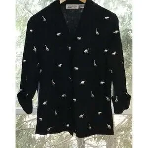 The Vintage Yves St Clair Button-Up Top is a stylish and unique piece featuring a black and cream animal print pattern, perfect for travel or safari-themed occasions. Made from linen, this top is lightweight and breathable, ideal for warm weather. The classic button-up style and size 10 fit make it a versatile addition to any woman's wardrobe, adding a touch of vintage flair to any outfit.