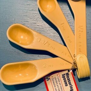 Beige plastic with original red and white tag (#98909). Dishwasher safe. Spoons are held together by a sturdy ring and show minimal wear consistent with age.