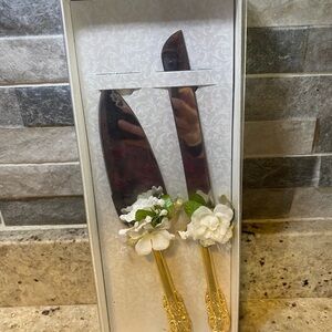 Enhance your special occasions with this elegant cake knife and server set. Featuring a luxurious gold finish and adorned with beautiful white floral accents, this set adds a touch of sophistication to any event.