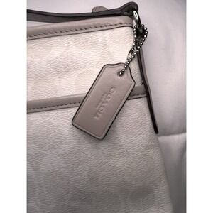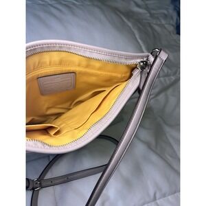 Coach Crossbody Bag Cream Canvas Stripe Logo Yellow Interior Pockets Zip Closure. Condition is Pre-owned - Excellent. Shipped with USPS Ground Advantage.