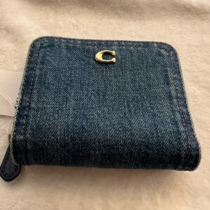 A classic essential, this wallet by COACH is realized in denim with leather trims and offers an array of card slots and a zip pocket to keep you organized.