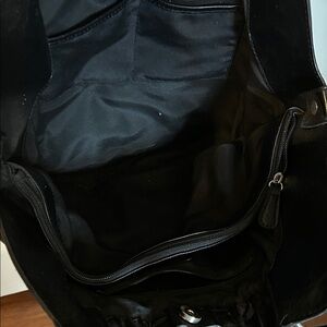 Chic black shoulder bag with gathered detailing. Features dual handles and a stylish emblem. Perfect for everyday use.