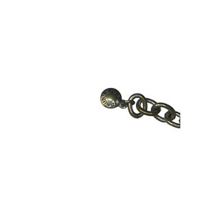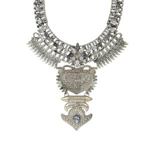 This pre-owned Baublebar statement necklace features a silver-toned multi-chain design with an ornate pendant. The pendant showcases intricate metalwork, including wing-like elements, a textured heart-shaped motif, and a tiered dangle. Numerous clear rhinestones adorn the pendant, adding sparkle. The necklace measures approximately 18 inches at its shortest length and includes an extender chain. The brand "Baublebar" is visible on a small tag near the lobster clasp. The metal shows minor wear consistent with a pre-owned item. Comes from a smoke free home!