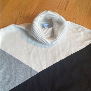 Stay cozy and stylish with this colorblock turtleneck sweater. Featuring a chic combination of black, gray, and white, this sweater is perfect for any occasion.