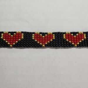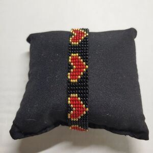 Bracelet is hand beaded using a loom. Made with black, red and gold Czech glass beads. Gold tone ribbon crimp ends with a lobster clasp closer. Light weight, great for all day wear. Add a pop of color to your outfit!