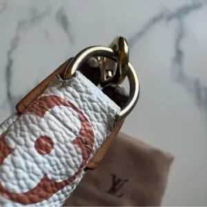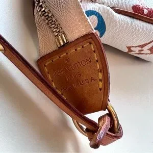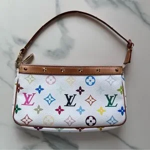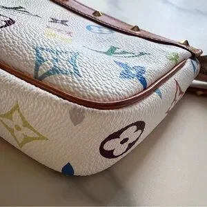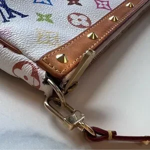 This iconic and coveted vintage Louis Vuitton X Takashi Murakami Multicolore Pochette Accessoires is in white monogram multicolor canvas in gold hardware. Features multicolor coated canvas leather, vachetta cowhide leather trim with brass studs, a zipper closure and a detachable shoulder strap with brass studs.