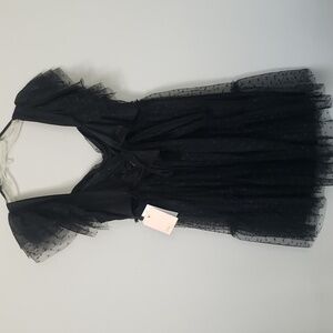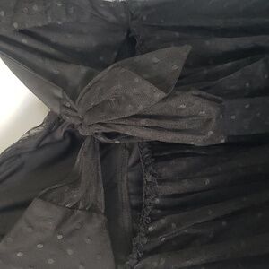 Elegant black dress with sheer polka dot design. Features ruffled sleeves and a tiered skirt. Bandeau style bodice that ties in back with sweetheart neckline and baby doll styling. Triple flounce cap sleeve fully lined and padded.