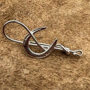 This is a nice pin of a horseshoe and a swirl of metal that might be a riding crop