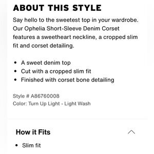 Brand new with tags - Women’s Levi’s Ophelia Short Sleeve Denim Corset Top Light Wash Cotton. Color: light wash. Size: S.