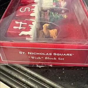 Celebrate the season with this charming WISH winter & Christmas holiday block shelf sitter set. Featuring vibrant red and white painted blocks with white snow and white lettering, each block features a different character. A red cardinal on his birdhouse, a sweet snowman, a Christmas tree and a squirrel with his nut, getting ready for winter.
