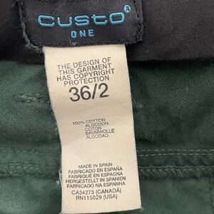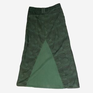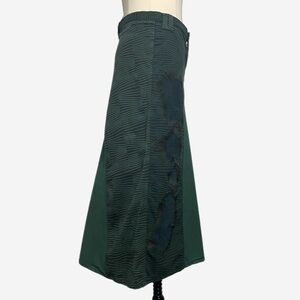 Great preowned vintage condition. Minor fading from normal wash and wear. Green A-line maxi skirt. Low waist. Zip and button closure. Green 100% cotton chino material. Mixed pattern. Distressed embroidered details along both sides. Made in Spain. Tagged a 36/2 and fits like an xs.