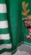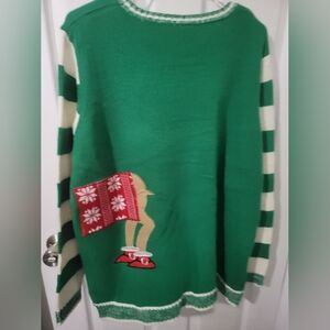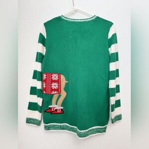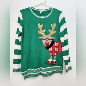 Festive green sweater with a reindeer design. Features gold antlers and striped sleeves.