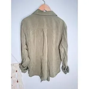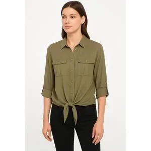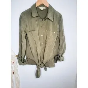 Michael By Michael Kors Shirt Womens Size Small Olive Green Button Up Tie Front Utility Boho