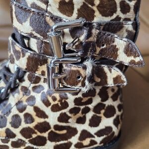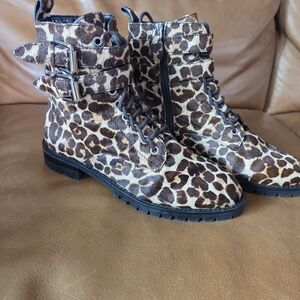 Stylish cowhide animal print boots. Lace-up front with side zipper. Durable rugged sole. Interior lining is peeling, but exterior is like new, no box