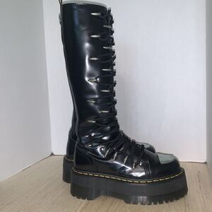Info-Dr. Martens Women's 1B60 MAX LTT Knee High Quad Platform Boots Black Buttero Leather US 7 EU 38 UK 5RARE, Sold Out and DiscontinuedBoots have a 2" platform and they are 17" total from top to bottom.Details-Tread loudly. The towering 1B60 Max boot is secured with an extreme lace-to-toe lacing system anchored by futuristic shiny silver hardware. Built from Buttero leather with a metal toe plate. The boot is fitted with an inside zip for easier access and stands on our highest-ever Quad Max sole marked with our signature grooving and yellow welt stitching. The top of the boot is tagged with a black and yellow heel loop. Buttero is a full-grain, smooth leather, with a satin gloss and premium supple feel The Quad Max sole is our tallest to date only for the brave. With a chunky tread pattern. A sole to make you f