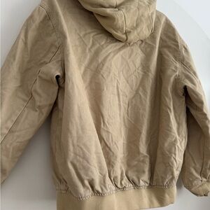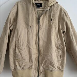 Casual khaki jacket with hood. Features front zipper and pockets. Ideal for everyday wear.