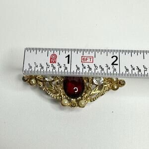 Vintage Red Gem Pearl Brooch Victorian Style Pin Gold Filigree with Crystals