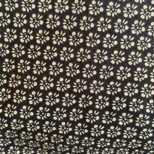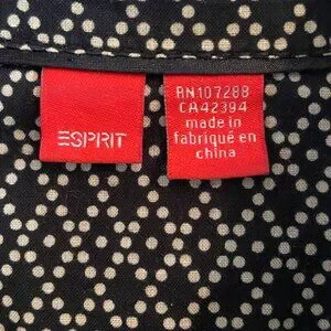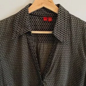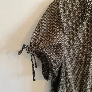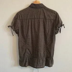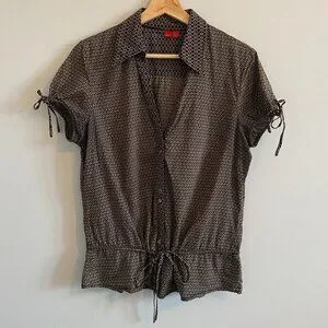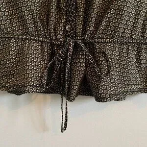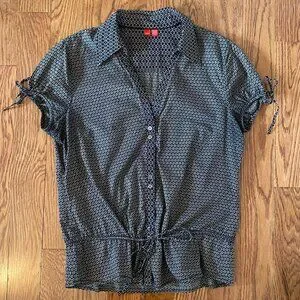 Vintage Esprit top from the 1990s. Short sleeved button up shirt. Charcoal grey and white dainty, abstract, floral print. Folded collar with open v-neck and button front. Gathered waist and sleeve openings with adjustable drawstring bows. Longer length. No fabric content tag.