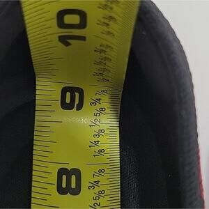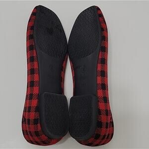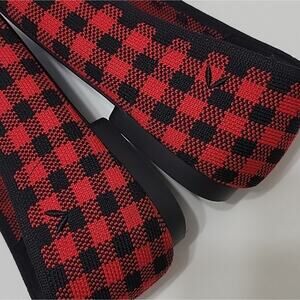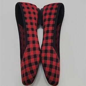 This fashion article worn several times. knit upper. heels are in excellent condition. no box. red and black plaid design. very comfy. sustainable. v cut. square foot.