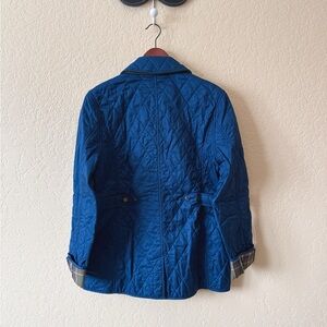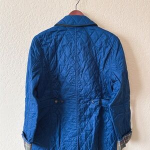 Navy quilted jacket with plaid cuffs. Features button closure and utility pockets. Ideal for versatile wear.