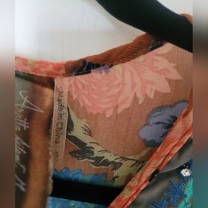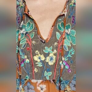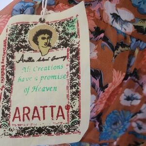 From iconic brand Aratta, this beautiful boho tunic featuring vibrant floral embroidery. The tunic showcases a mix of blue and orange hues, perfect for adding luxury to your wardrobe.