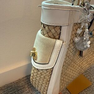 Stylish Coach tote with woven design. Features tan and cream colors. Perfect for everyday use.