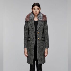 Excellent Preloved Condition HENRITA-GX is a below the knee length wool jacket with a lightweight down lining and masculine-inspired detailing: a straight silhouette, a front button closure and a classic collar. A removable fur collar adds a touch of refinement. With flap pockets and leather reece, this is the perfect layering piece. - Below the knee length - Straight silhouette - Center front button closure - Tailored collar - Flap pockets with leather reece - Down lining - Removable silver/pink silver fox fur collar - Brass military logo buttons - Comfort zone down to -10C/14F COMPOSTION & CARE INSTRUCTIONS Shell (Woven): 58% Wool, 22% Polyester, 14% Polyamide, 6% Acrylic. Lining (Woven): 100% Nylon. Filling: 90% Duck Down, 10% Feathers (Pekin Duck, Anas Platyrhynchos Domesticus). Finland Silver PTP 20” Length 40”