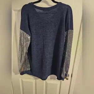 Elegant blue top featuring sparkling silver sequin sleeves. Ideal for evening wear.