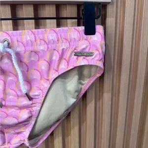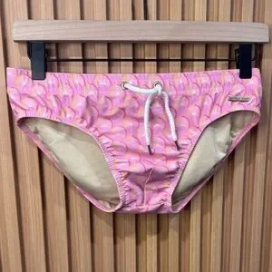 Chic swimwear with pink pattern and beige lining. Adjustable drawstring for comfort.