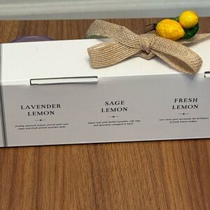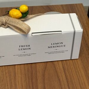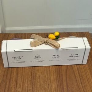 DW Home set of 4, 2 oz. Candles. Enhance your home with the Scented Candle Set or it’s a great gift to give for the holidays. Featuring delightful scents. Lavender Lemon, Sage Lemon, fresh lemon, and lemon meringue. candles add a touch of elegance to any room. Enjoy the soothing aromas and stylish design. Decorative box design