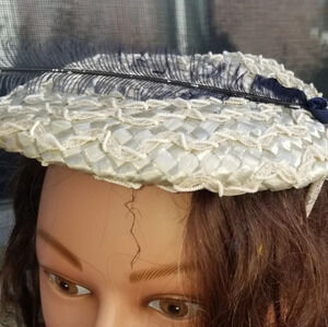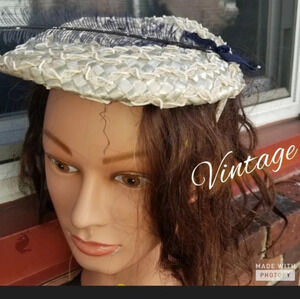 This hat is the bomb ! Although missing original netting, it is still super. And will stay on. I put it on in mild wind ..no issue..bendy pieces on sides work. Late 40's or 50's. 50% offers will not be accepted . This piece is rare and in really good condition for age.