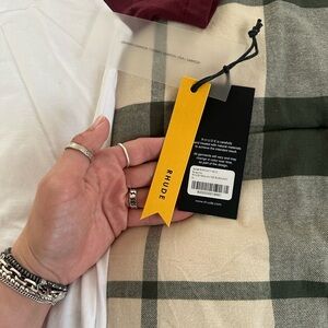 Casual Rhude tee with white body and maroon sleeves. Ideal for everyday wear.