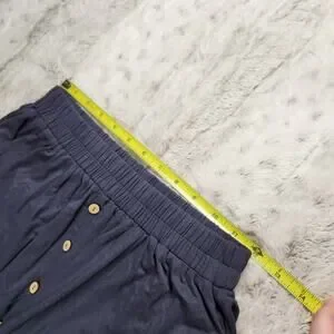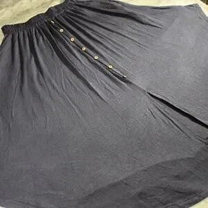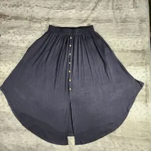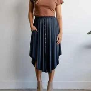 Beautiful, flowy, and luxuriously soft midi skirt with faux front button trim, elastic waist, pockets, mini front slit, and a rounded hem.