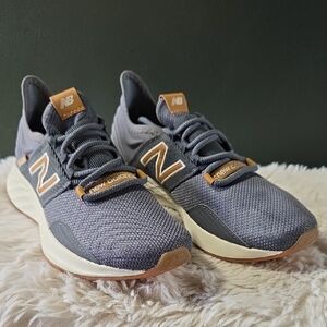 Stylish New Balance sneakers. Gray mesh upper. Tan accents on logo and sole. Comfortable and trendy.