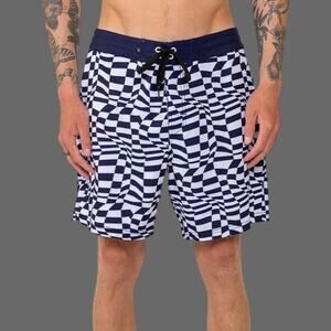 Rusty USA Warped Check Fixed Boardshorts in Navy, size 32, brand new with tags (NWT). These stylish boardshorts feature a classic fixed waistband and a comfortable fit, perfect for beach, pool, or summer adventures. MSRP $65.