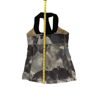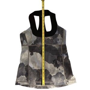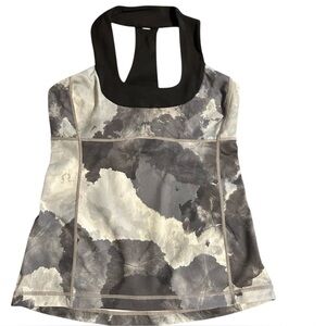 Lululemon Cloud Tank (Estimated Size 6) in a unique Abstract Print (Black/Grey/White). Classic high-neck, long-line fit with a keyhole racerback. Made with stretchy Luon fabric.