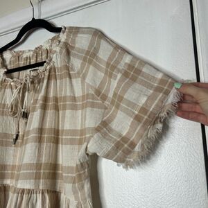 Pilcro Anthropologie Bette Beige Plaid Babydoll Linen Blouse Top size Small