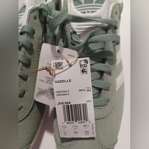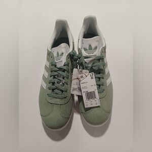 Stylish adidas sneakers. Green suede upper. White stripes and sole. Comfortable fit. New in box, make an offer. I went to Manhattan today, I went to Rockefeller Center and I saw many people wearing this specific kind of sneakers, 12/21/2025, I think they are #trendy can be unisex