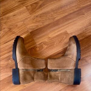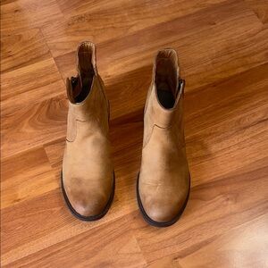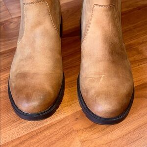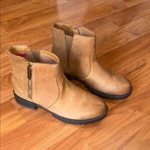 Chic tan ankle boots by Sorel. Sturdy black sole. Convenient side zipper.