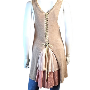 Free People Tan Knit Sequined Beaded Embellished Lace Up Ruffle Back Tunic Tank