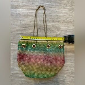 Add a pop of color to your outfit with this vibrant bedazzled mini bag. Featuring a stunning blend of red, green, and yellow, it's the perfect accessory for any occasion.