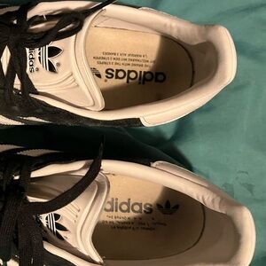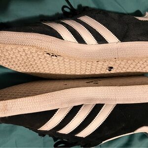 Classic Adidas Gazelle with iconic white stripes. Sleek black design.
